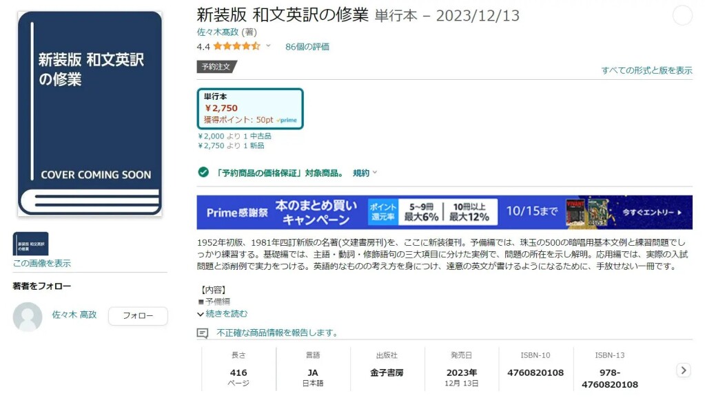 英作文(和文英訳)の往年の名著である『和文英訳の修業』(佐々木高政 著、文建書房)。その新装復刻版が金子書房より出版される旨の情報が以前より出回っています。実際、Amazonや楽天ブックスなどで商品ページが作成されており、予約受付中の状態になっております。