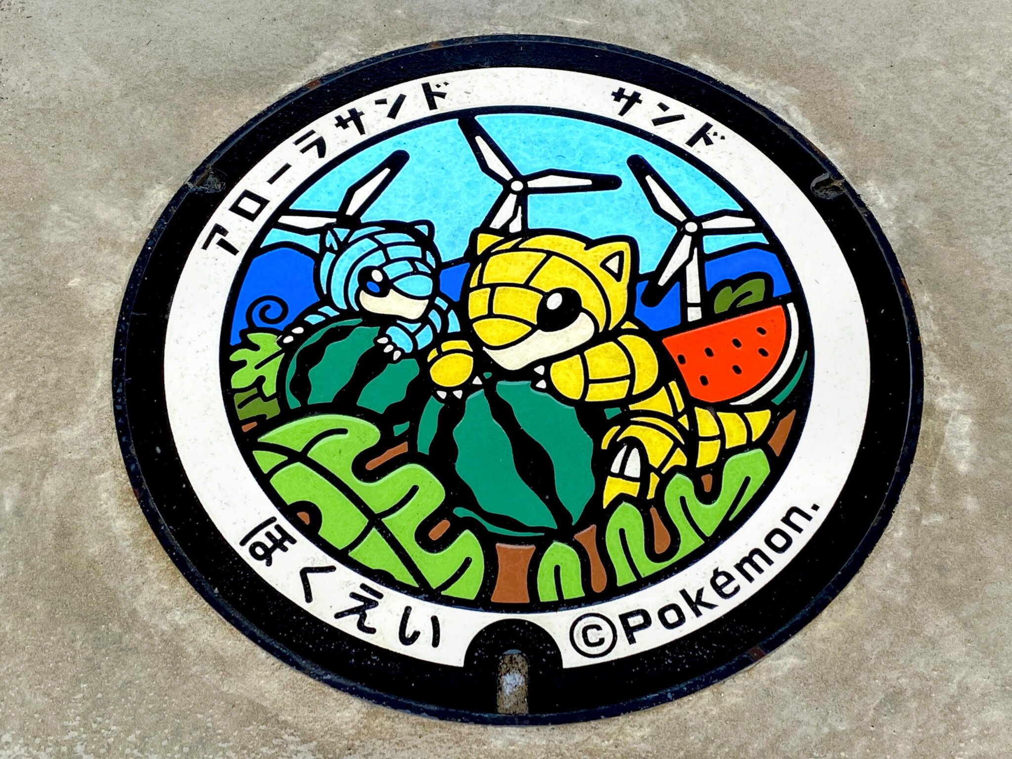 - 【ご当地マンホール】道の駅北条公園(現「道の駅ほうじょう」)に設置されていた「ポケふた」(アローラサンド/サンド) 2021年6月撮影【鳥取県北栄町】