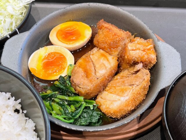 2023年・2024年にも同名のメニューが販売されていた時期がありましたが、それとは明らかにモノが違っています。角煮の柔らかさはそのままに、より厚切りになり、食べ応えが格段にアップしています。それに加え、備え付けがキャベツからほうれん草と煮卵に変更されており、容器も鉄皿プレートに変更されていることで、「角煮」としての完成度が全体的に上がっております。おそらくですが、「揚げる豚テキ」の調理法を応用しているものと思われます。