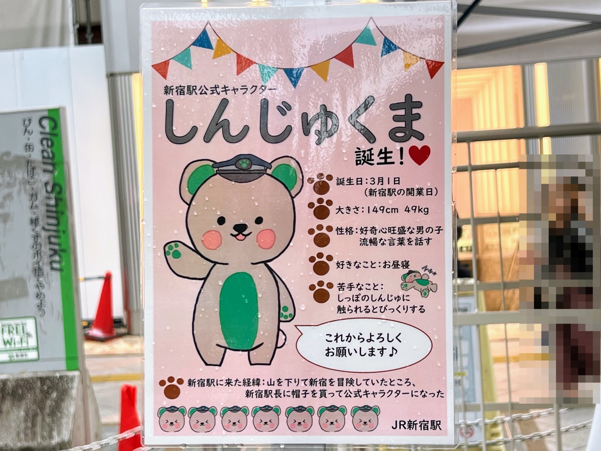 2025年3月1日に新宿駅が開業140周年を迎えるにあたり誕生。名前は「しんじゅく」と「くま」を組み合わせたもので、それ以上の意味はないものと思われます。