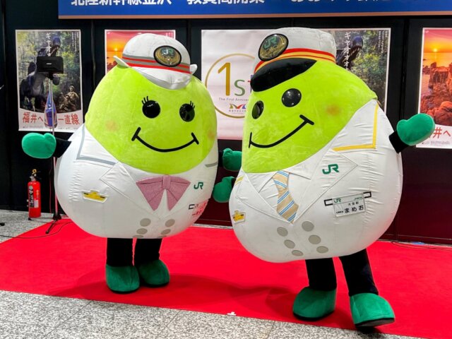 「まめお」「まめこ」ともに、JR東日本の駅長衣装を身にまとっているのが基本となります。