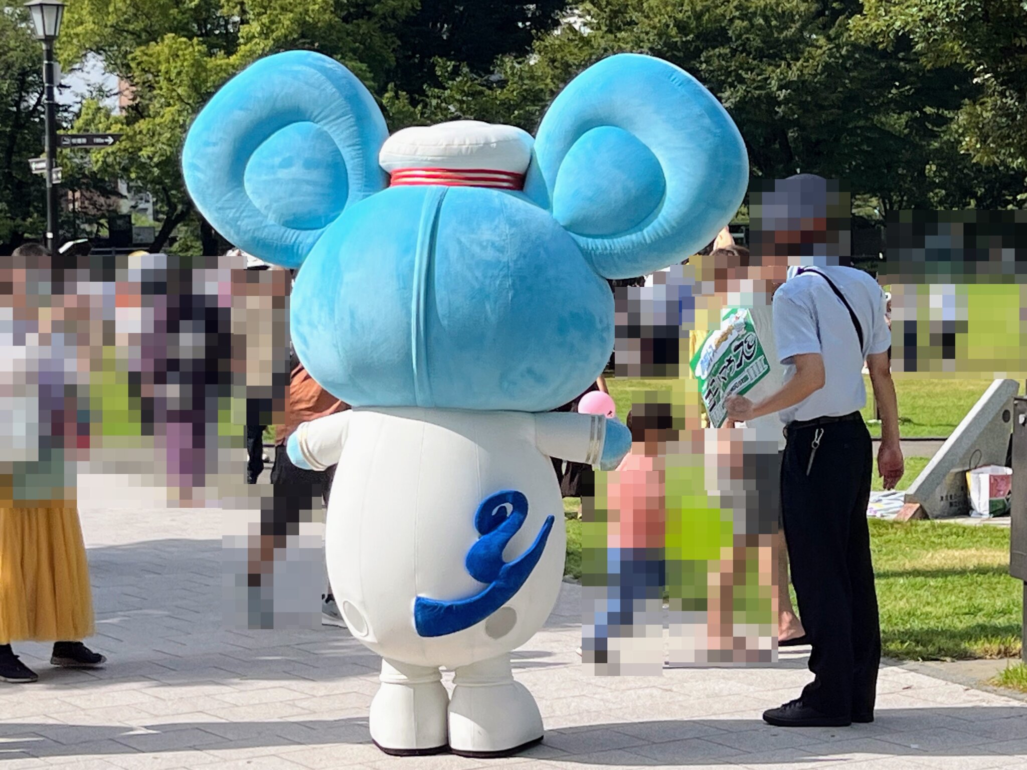 JR東日本の駅長衣装(男性用)を着用。大きな耳が特徴の水色のネズミでございます。
