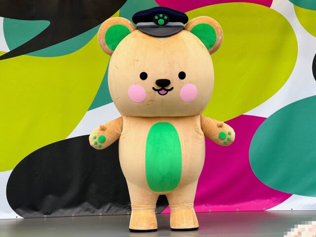 茶色と緑色の毛皮が特徴のクマで、オリジナルデザイン(標章が肉球)の駅員用帽子を着用しています。尻尾は「しんじゅ」模様であり、公式でもチャームポイントとされています。