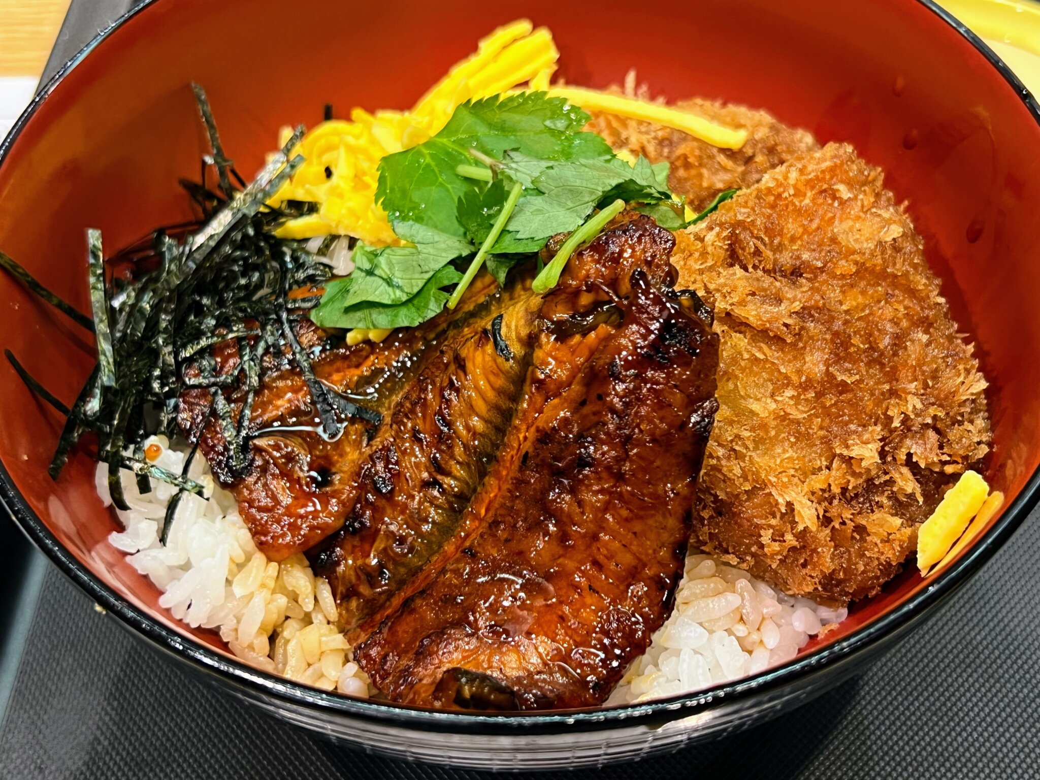 今年は斬新な丼メニューがいくつも出ましたが、この「うなかつ丼」もその1つ。トンカツとウナギの蒲焼きという、なかなか無かったメニューですね。美味と美味を組み合わせて、絶品な味わいでございました。